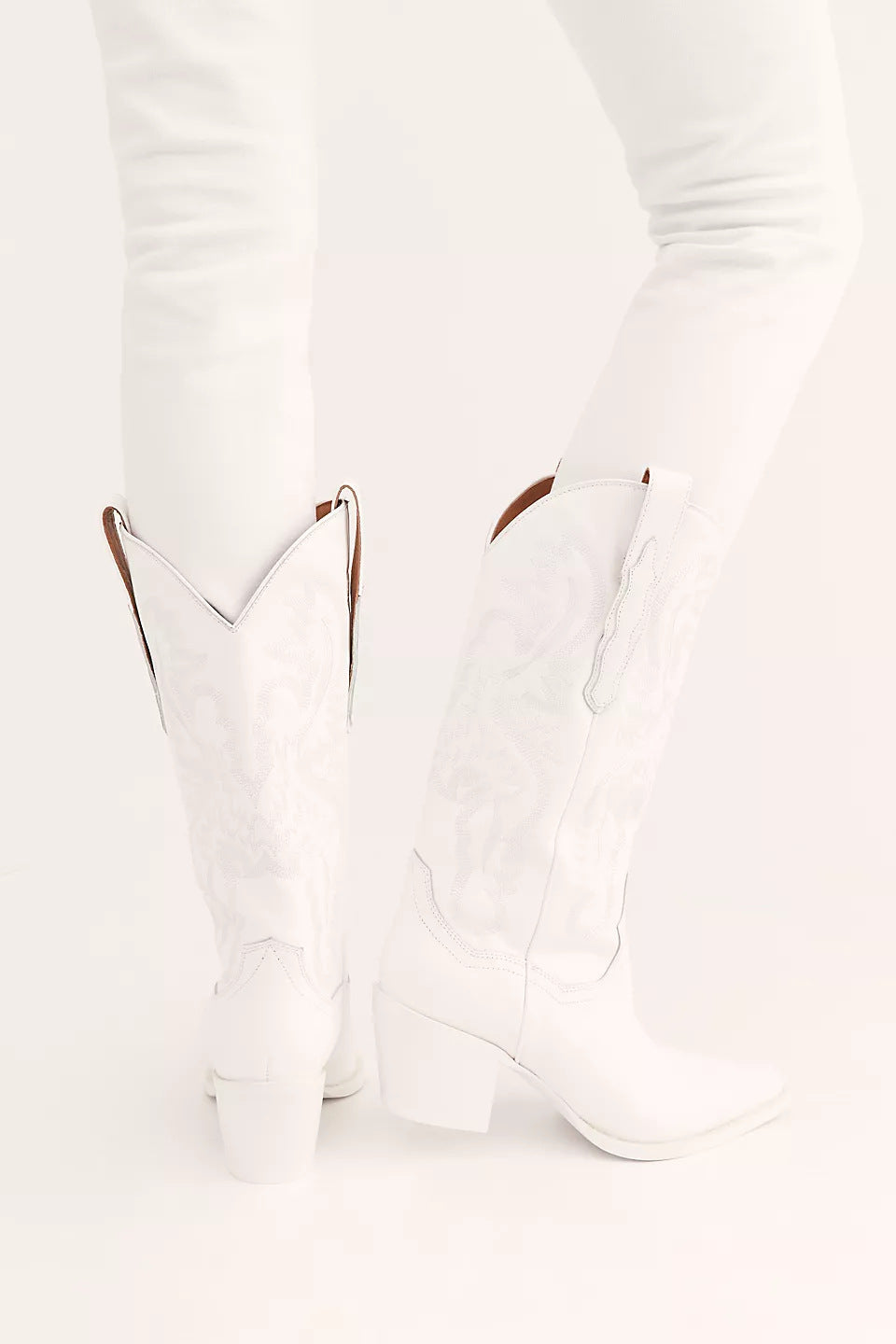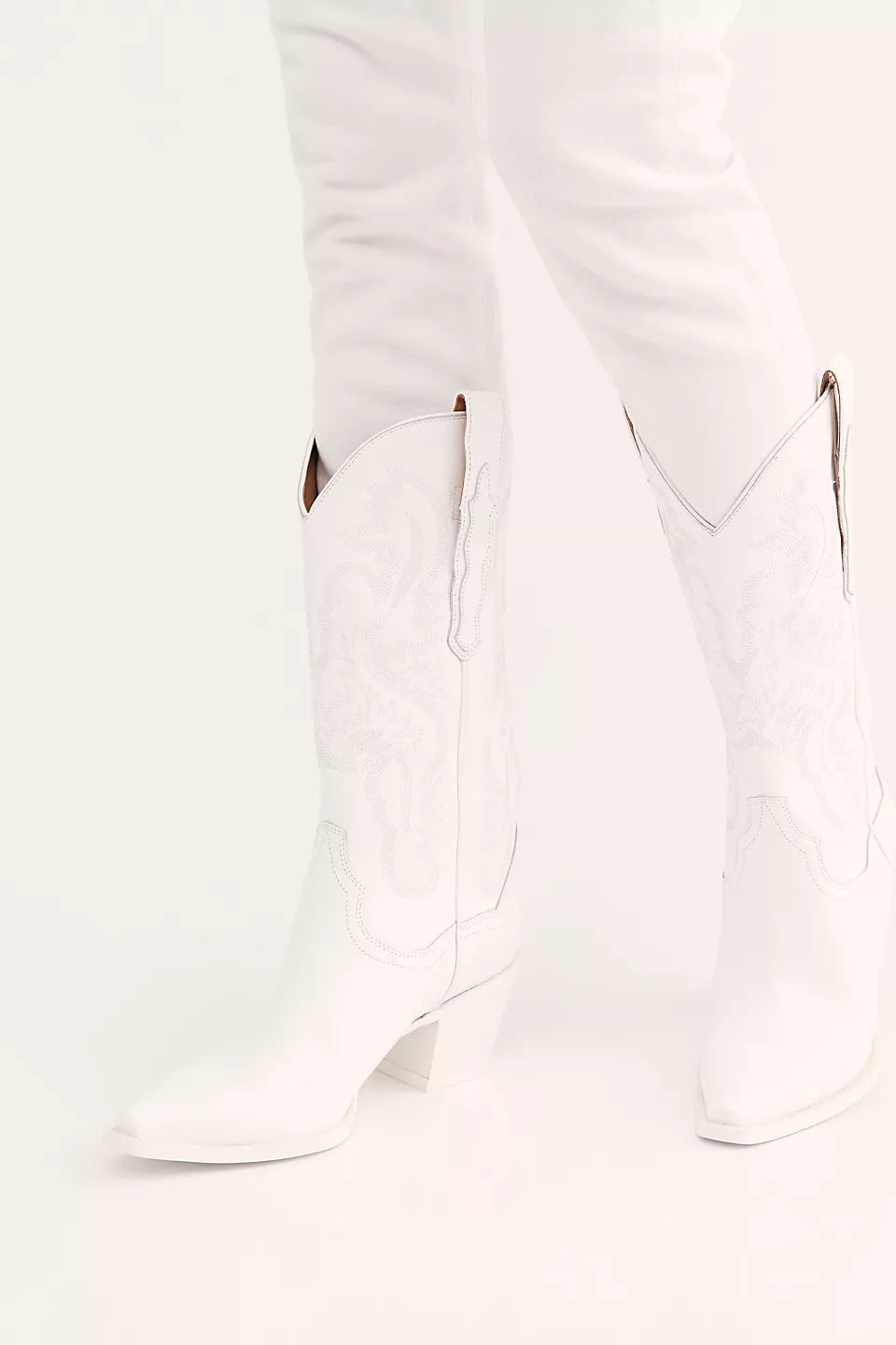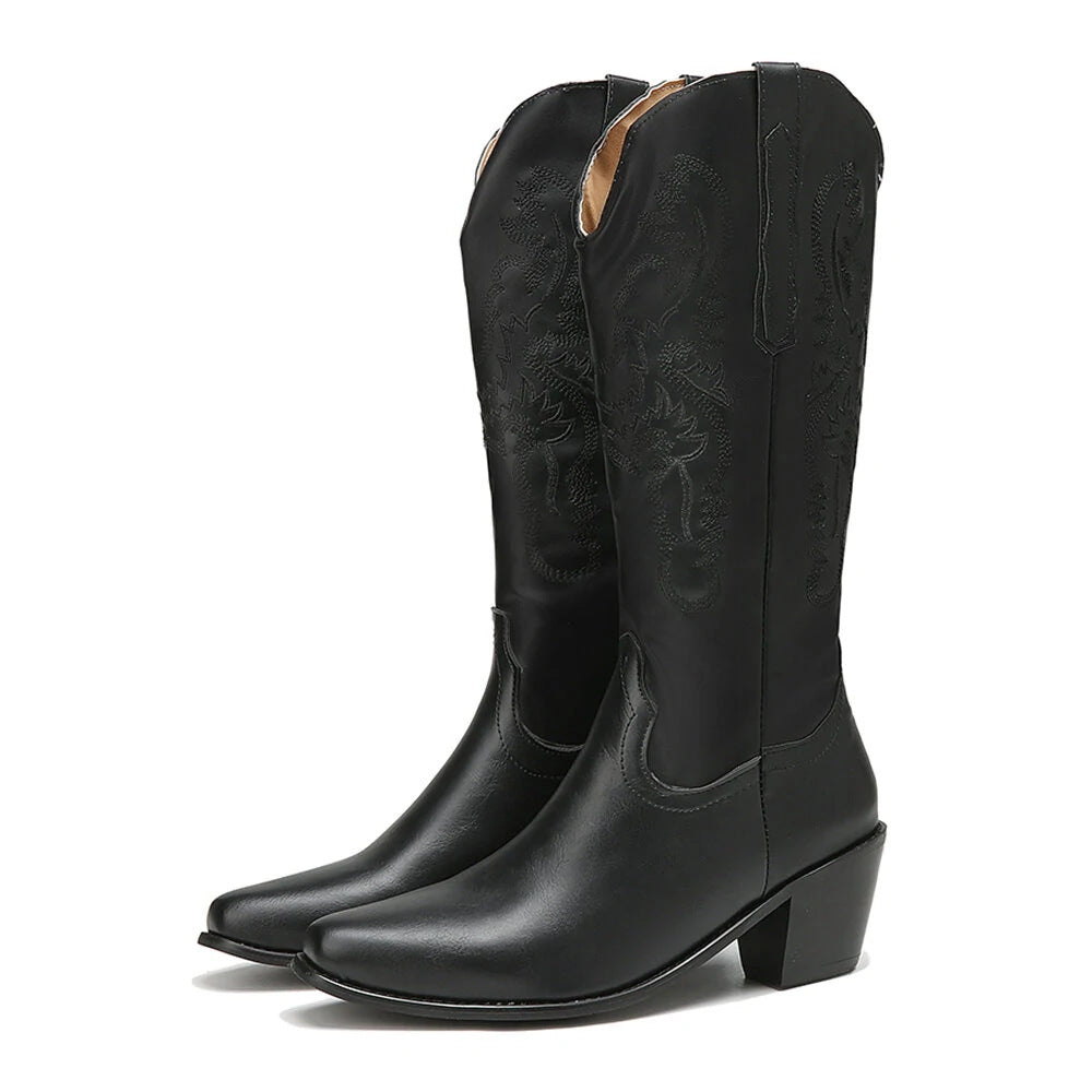 Retro embroidery mid calf western cowboy boots for women White chunky heels cowgirl boots